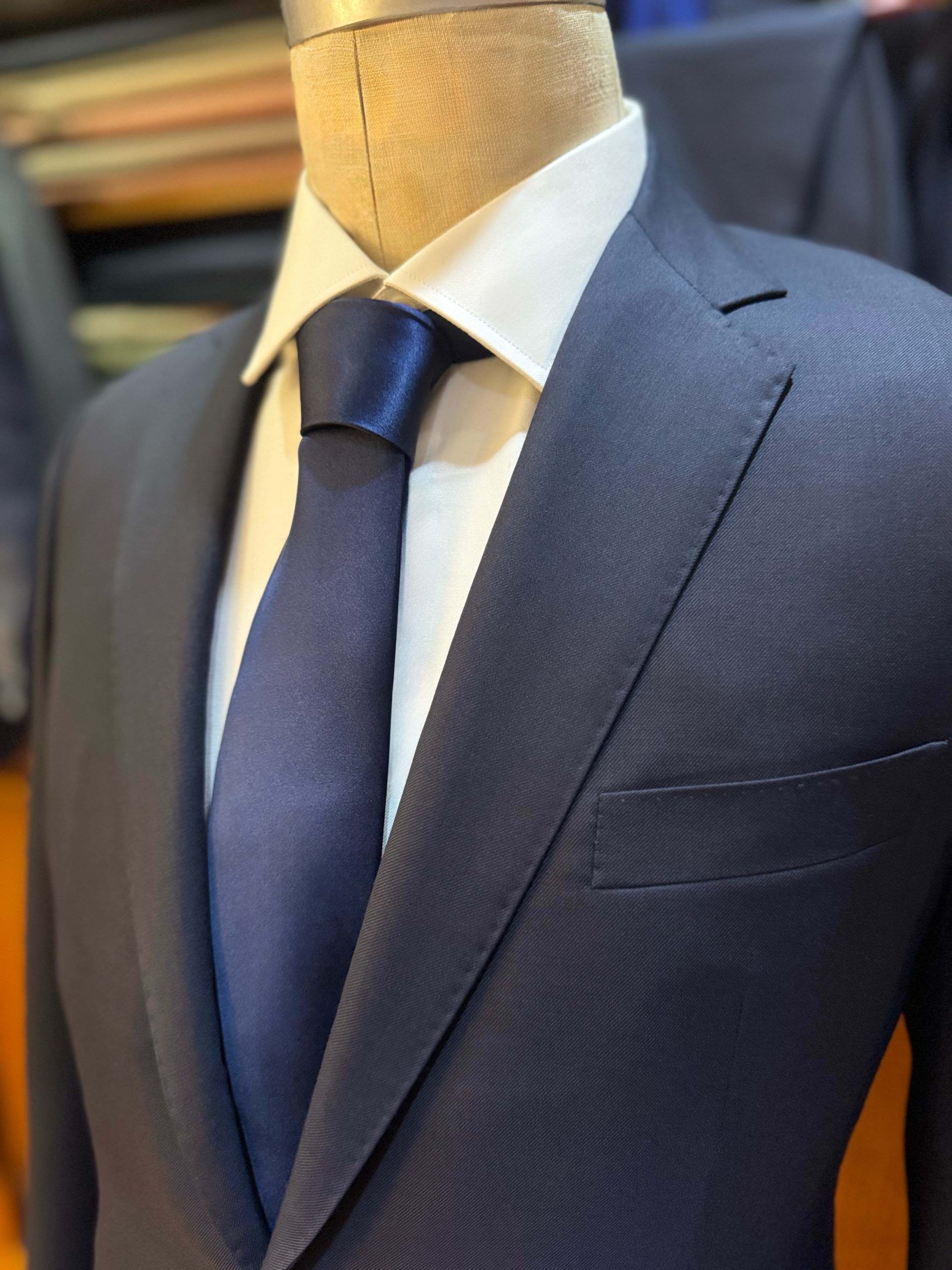 We offer an extensive collection of over 300,000 fabrics sourced from the finest Italian and English mills of Loro Piana, Holland & Sherry, Ermenegildo Zegna, Fox Brothers, Scabal, Piacenza, and more. There is no doubt we will guide you to your perfect fabric. During your consultation, we will explore the occasion for your suit and any specific details you would like to include. If you are looking for our recommendation, we highly suggest your first bespoke suit to be a classic navy wool suit. This color is incredibly versatile, ideal for any event that requires a suit – be it a job interview, business meeting, or formal gathering. It complements a variety of shirt and tie combinations, allowing you to easily change up your look. A navy suit is often regarded as the “workhorse suit”, as you can wear it multiple times a week without anyone noticing. Start with a reliable staple that you will find yourself reaching for time and again then gradually expand into bolder fabrics to build up your wardrobe.